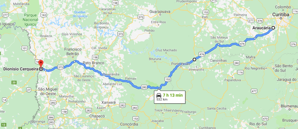 A rodovia BR476 até União da Vitória/PR estava em condições boas, mas com um tráfego muito grande de caminhões. O Google Maps sugere ir por Guarapuava, utilizando a BR277, e é o caminho que deveríamos ter utilizado.