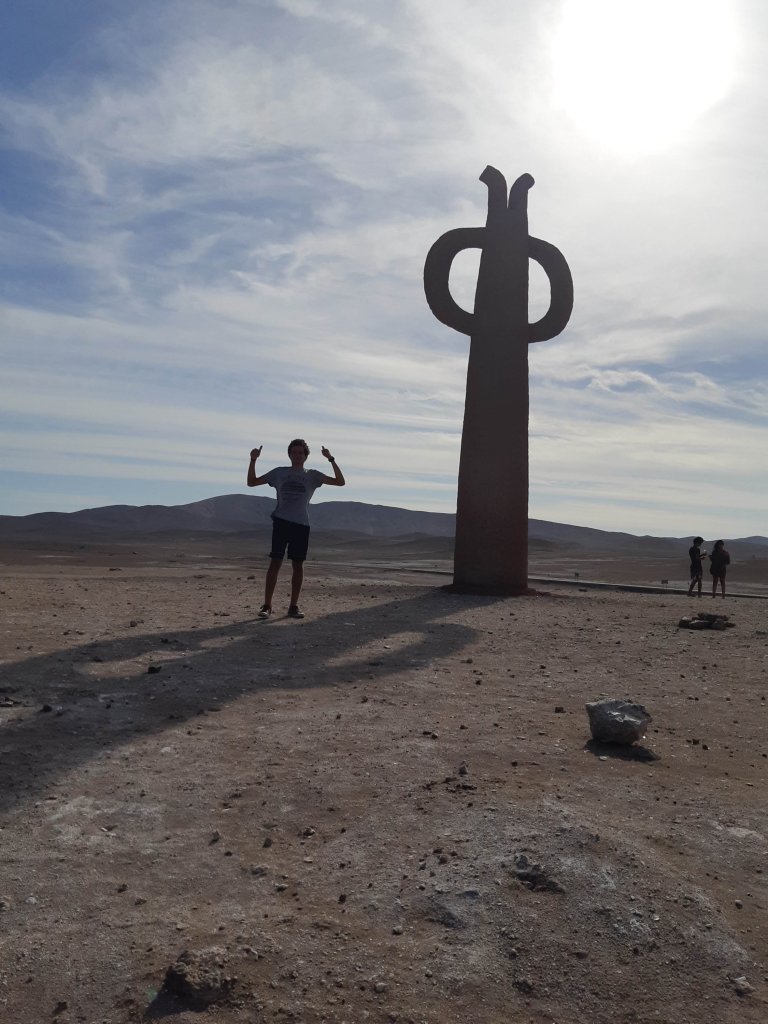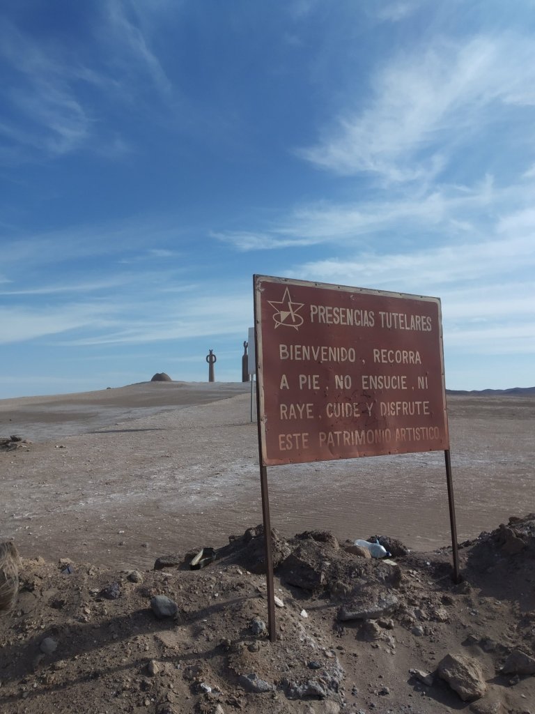 Faltando uns 20km para chegarmos na cidade de Arica encontramos esses monumentos. Não entendemos bem o que simbolizavam. Na placa dizia Presenciais Tutelares. O importante era registrar!