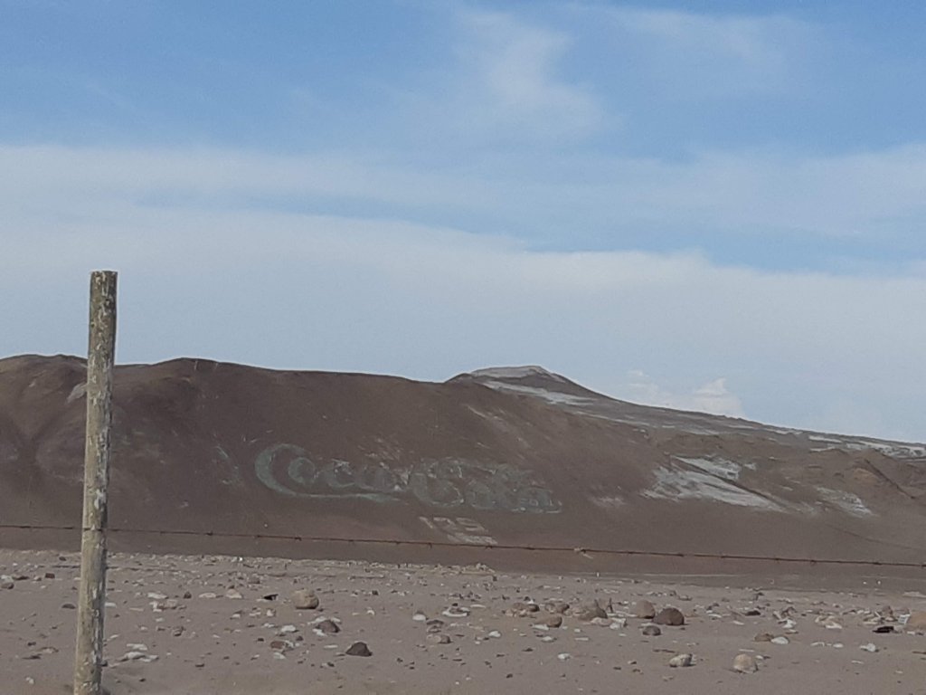 Foi nesse trecho, chegando em Arica que conseguimos, da estrada mesmo ver o maior logotipo da Coca-Cola. Para quem quiser conferir, é possível ver pelo Google Maps Satélite. Depois ficamos sabemos que era feito de garrafas vazias.