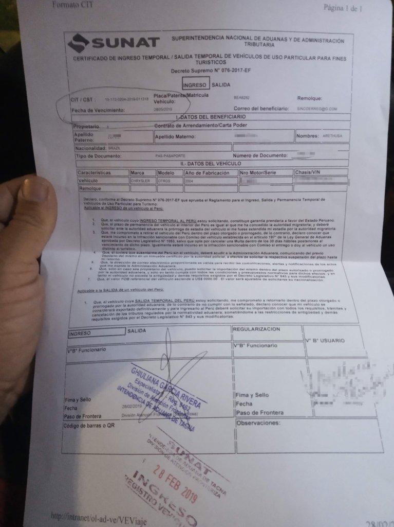 No mesmo prédio é feito a saída do Chile e a entrada no Peru. Primeiro procedimnto é realizar a saída do Chile tanto das pessoas quanto do veículo. Depois você preenche um documento, uma espécie de lista onde coloca seus dados e dos acompanhantes, do veículo também. Após esse procedimento, é dado entrada das pessoas no Peru, carimbo nos passaportes. Bagagens devem ser revistas foram do veículo. Toda a bagagem tem que ser levada para passar pelo scanner e vistoria dos agentes. Após deve ir a um setor chamado SUNAT, onde o proprietário do veículo deve estar presente, para o procedimento de internalização do veículo no país. Seria análogo a nossa Receita Federal.