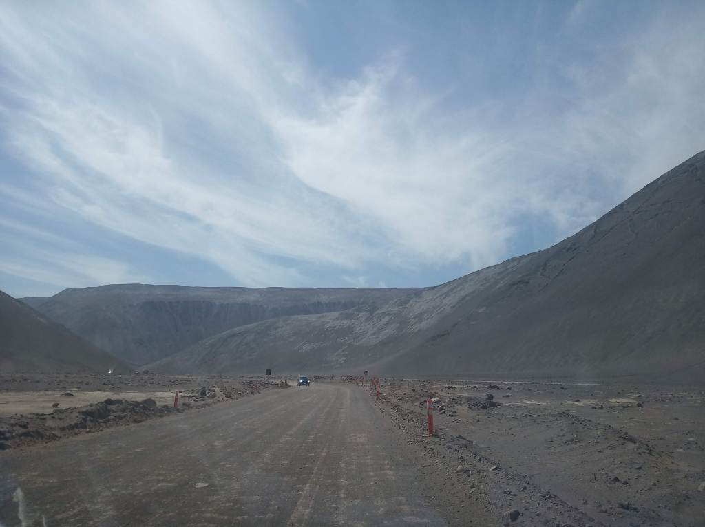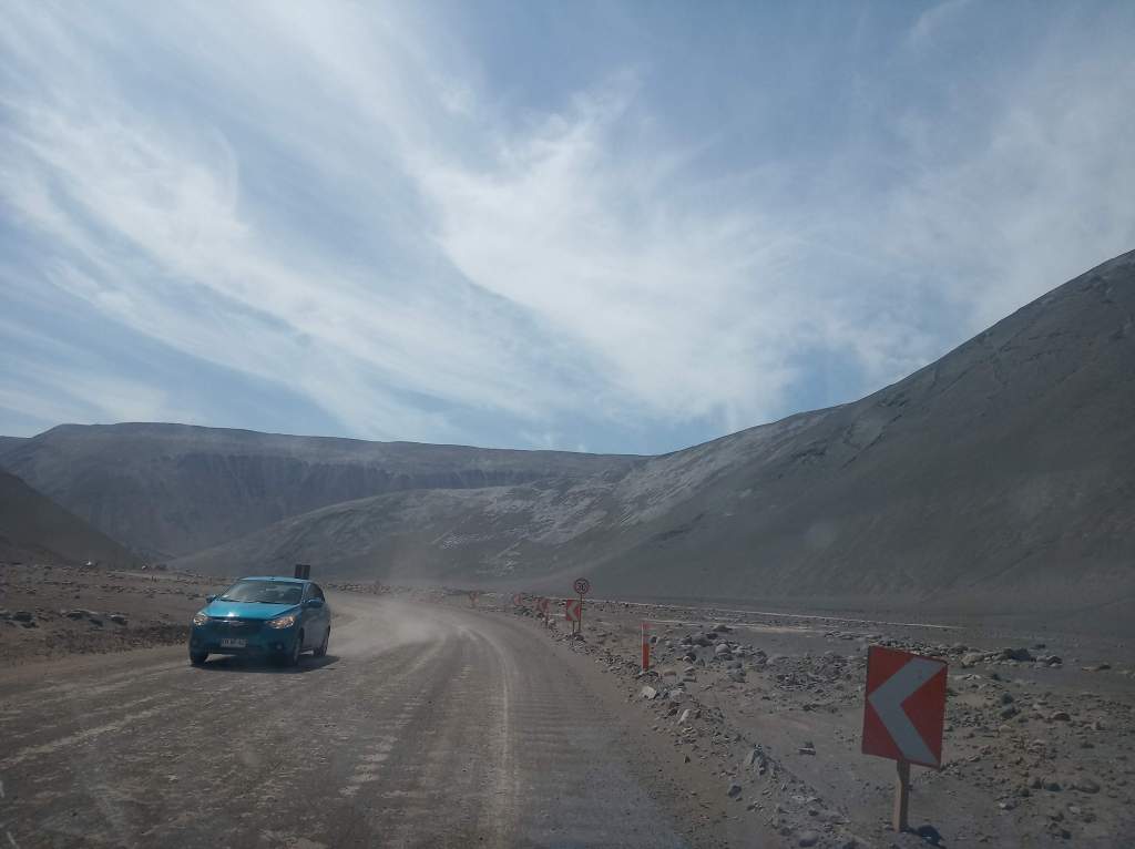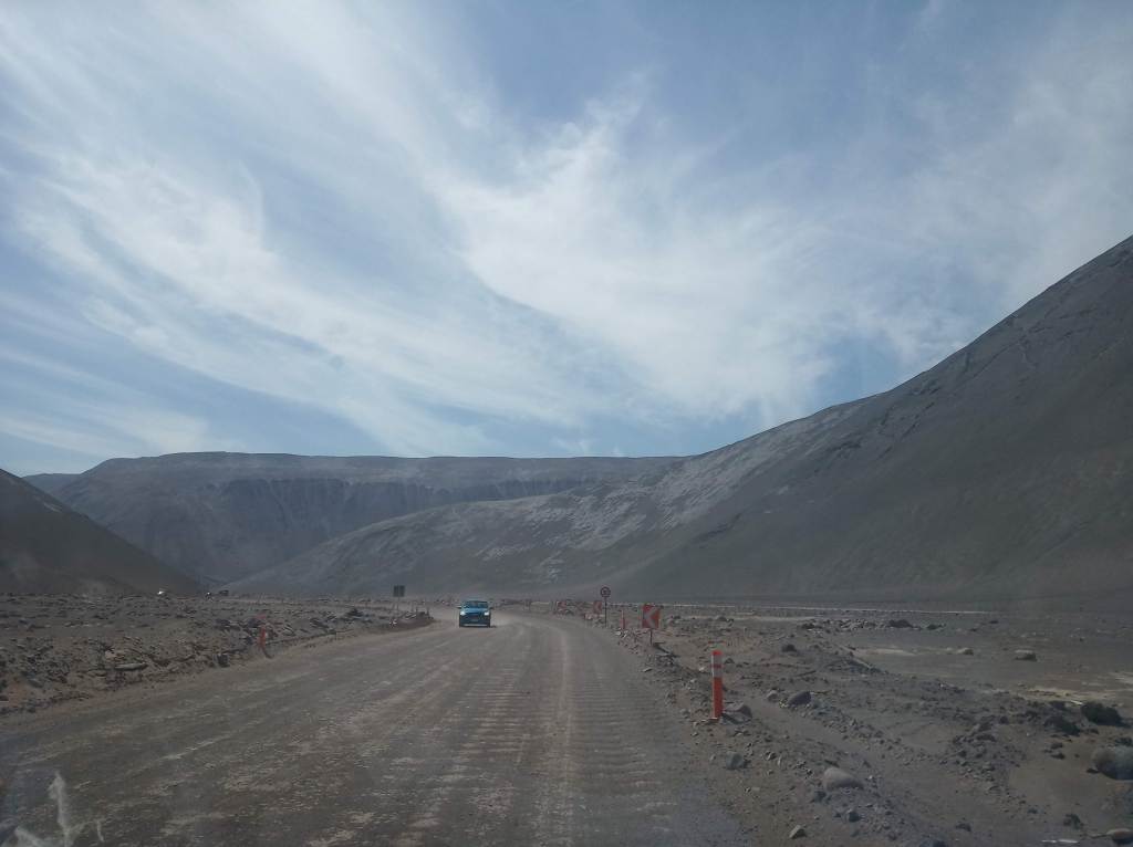 Partindo de Humbestone fomos em direção a fronteira com Peru. Levamos cerca de 3 horas para cruzar 260km. Nesse trecho a estrada está em perfeitas condições. Uma obra no caminho, com desvio por entre as montanhas.
