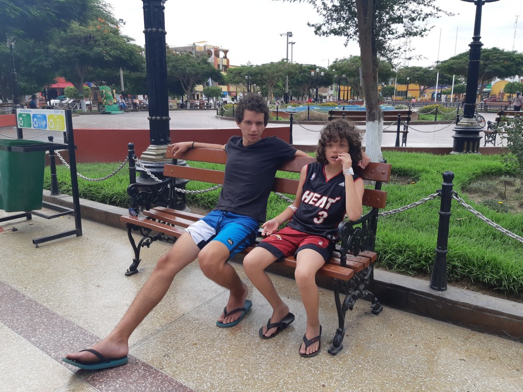 A praça central chamada Plaza de Armas de Nazca tem muitas árvores e bancos que fornecem sombra para descanso nos bancos. Refúgio para nós que estávamos esperando a alta do Felipe. Em volta dessa praça se concentram bancos, caixas eletrônicos, farmácias.
