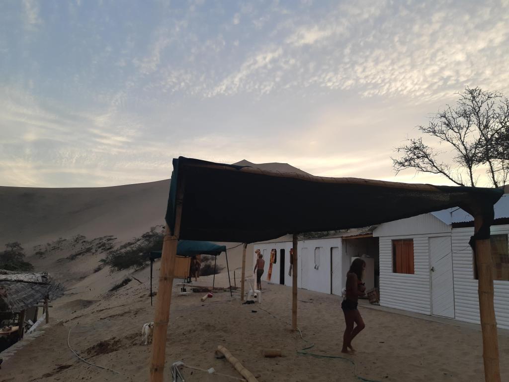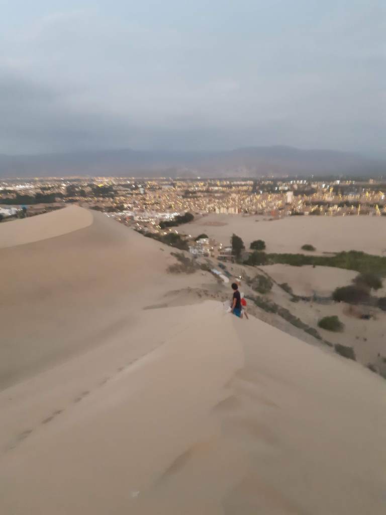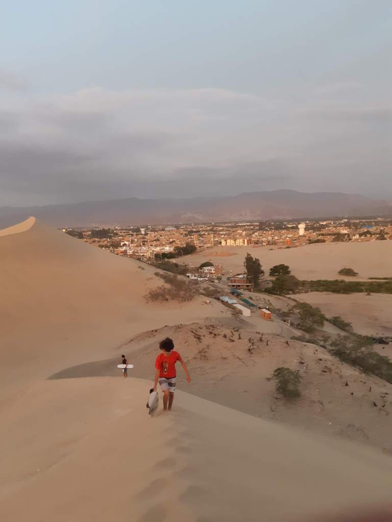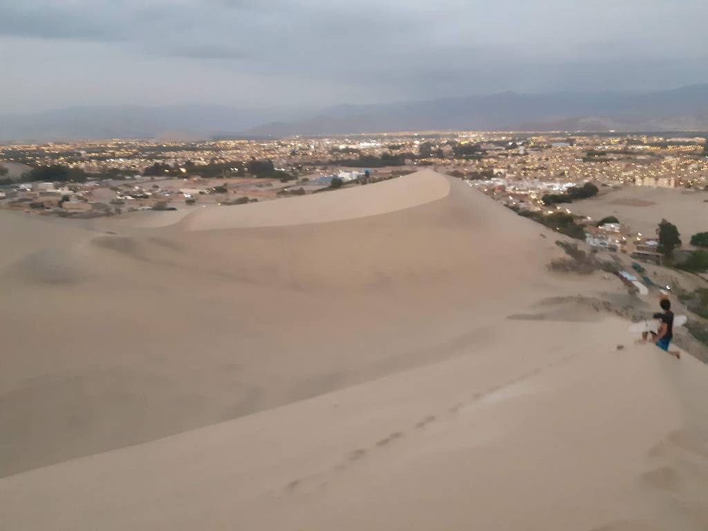 Dunas gigantes, gigantescas… Eu não consegui subir nem na metade. Os meninos subiram até o topo. O lugar fornecia as pranchas para sandboard , sem qualquer custo. Pagamos a hospedagem lá mesmo em dinheiro, 10 Soles por pessoa…