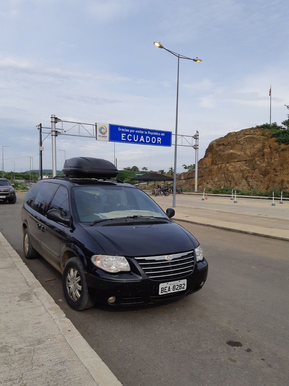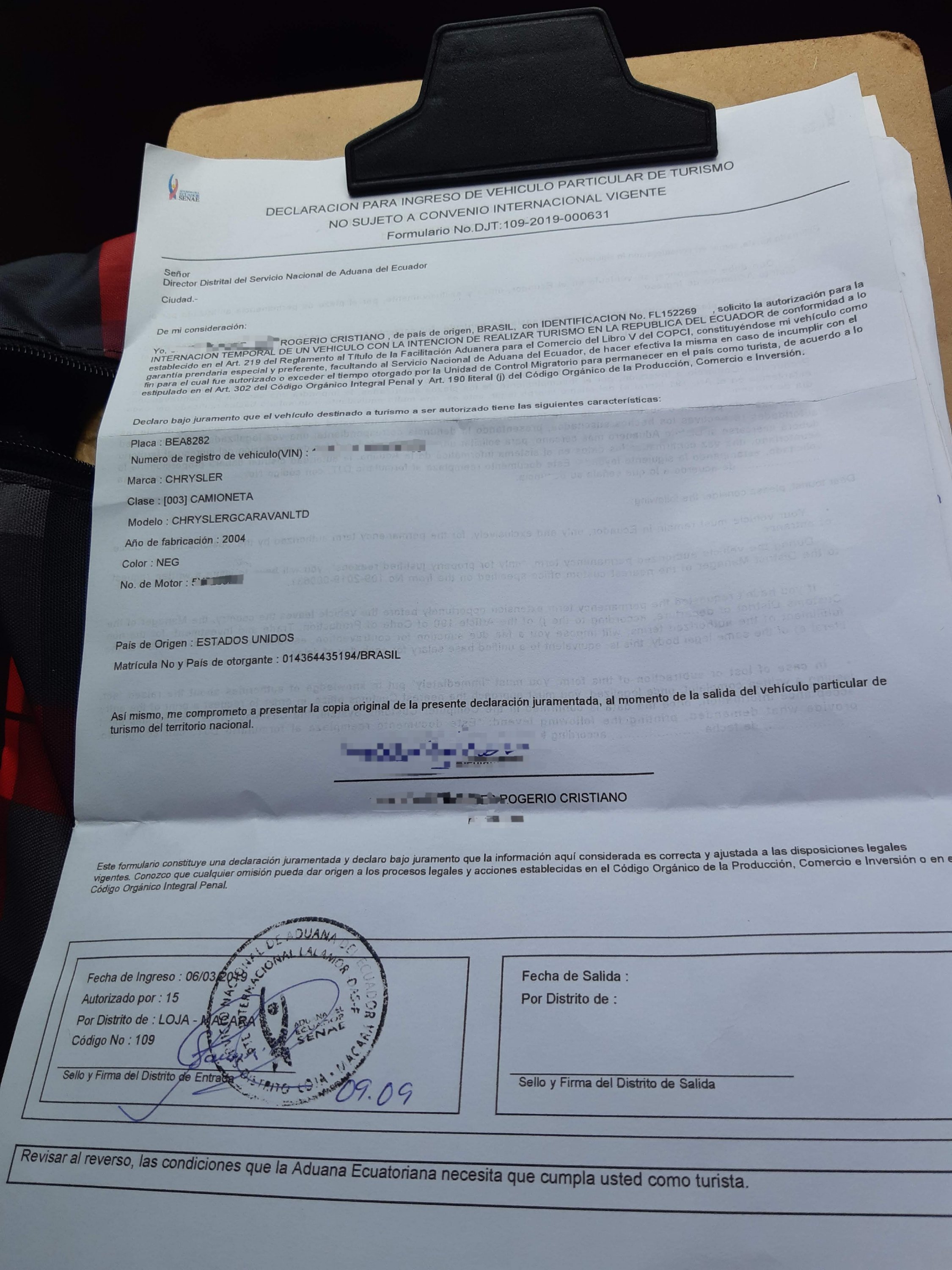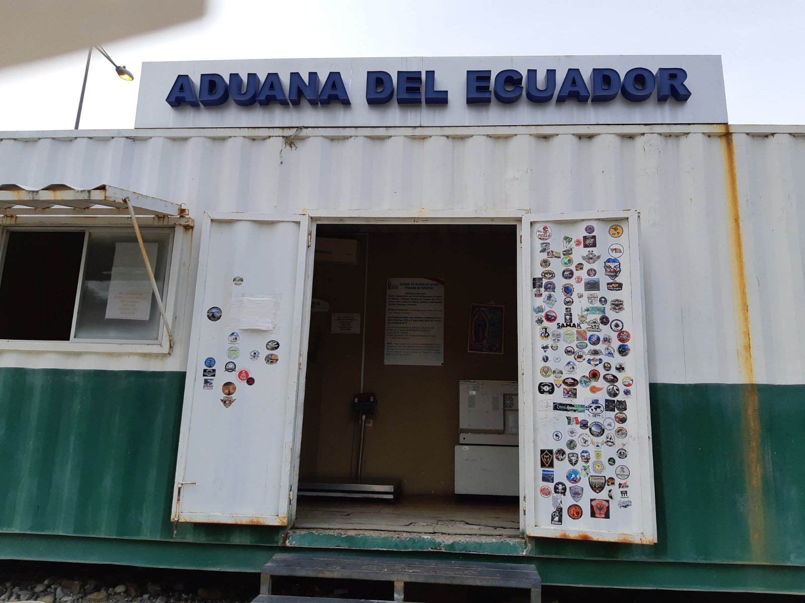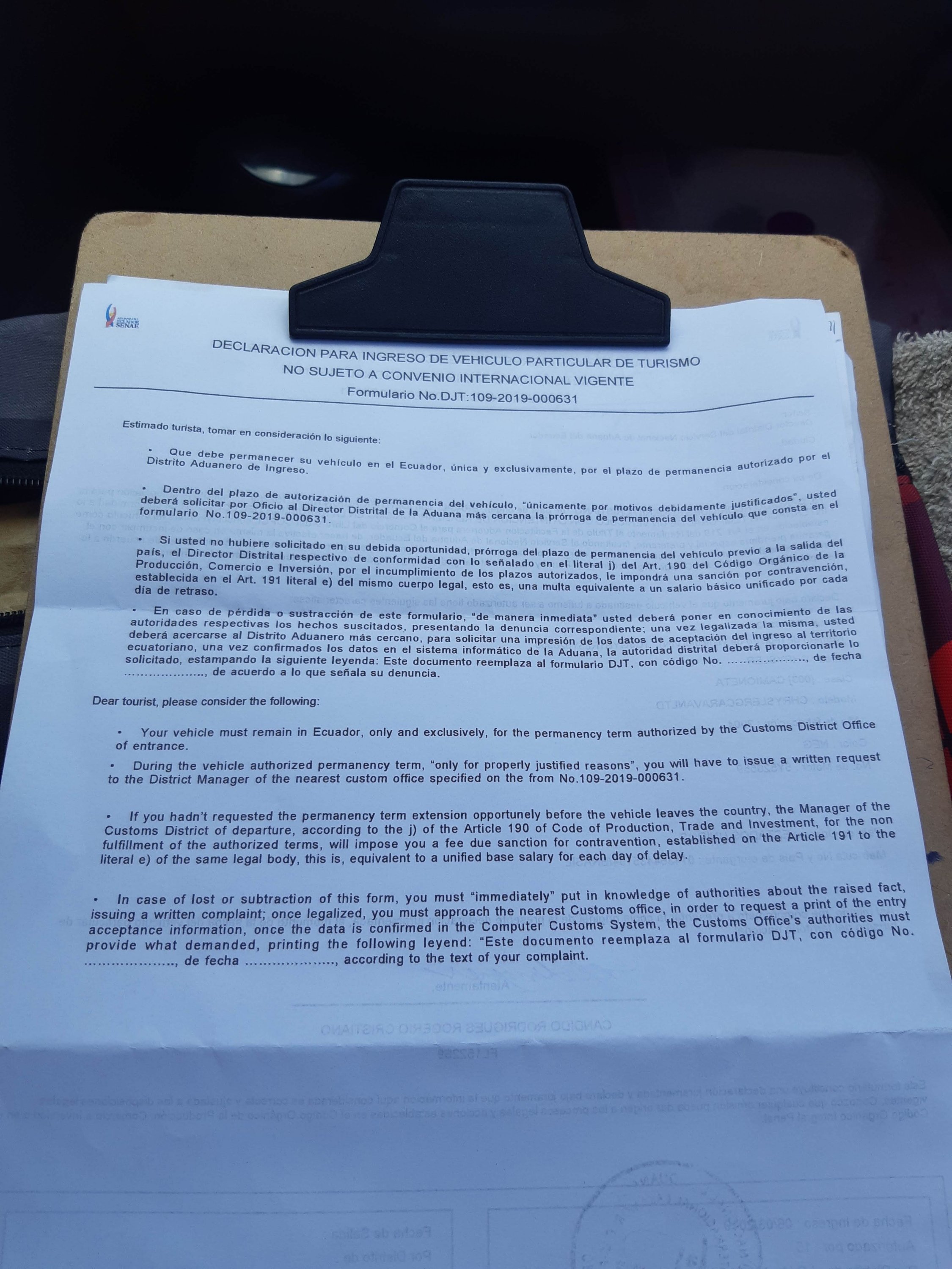 Agora já no Equador fomos dar entrada na Aduana. Já estávamos esperando por um cansaço! Mas foi relativamente tranquilo. Papelada para preencher, pouca gente. Interessante que você tem que dizer quantos dias pretende ficar no país. A advertência é que se não sair no prazo paga multa de 300 dólares por dia de permanência. Para não correr riscos declarei que ficaria 30 dias, embora os planos fossem de uma semana no máximo.