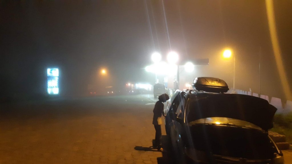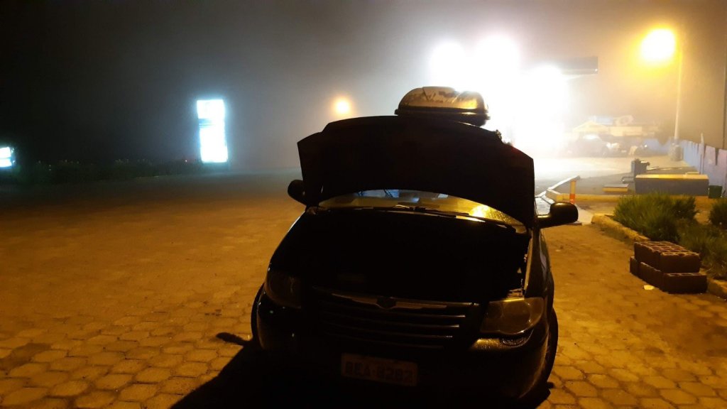 Dessa vez ela começou a falhar nas subidas. Já estava noite, caia uma chuva fina e para ajudar a neblina e o pior sem acostamento. Novamente estávamos entregue a providência divina. Quisera Deus ali fosse o fim da nossa viagem bastava vir um outro veículo com mais velocidade que não teríamos a mínima chance. Era impossível enxergar mais de 20 metros a frente. A Caravan parou por pelo menos 10 vezes. Não chegava a percorrer 10km sem falhar e desligar. Até que encontramos um refúgio a direita entre pedras da montanha e por ali permanecemos por uns 20 minutos aguardando esfriar, seja lá que peça fosse. O fato é que a subida da parecia infinita, e o GPS não informava mais nada, nem onde era a próxima cidade, quando já tinhamos percorrido, quanto faltava… mais nada!