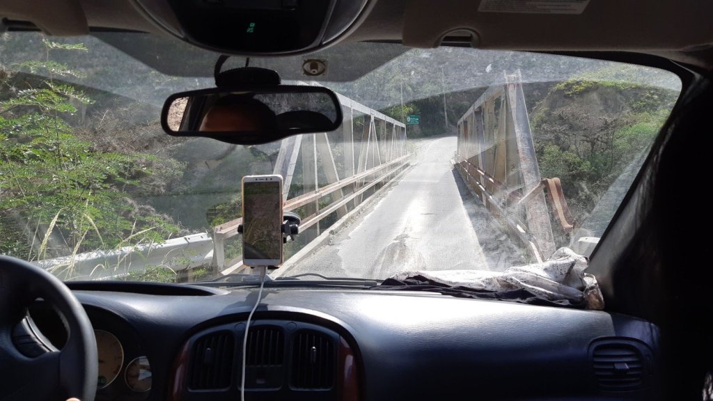 Chegamos a uma ponte metálica, e começou a subida. Essa parte da estrada já menos sinuosa. E finalmente, a internet 3G já dando sinal de vida conseguimos contato com a Pyganflor e encontramos o acesso.