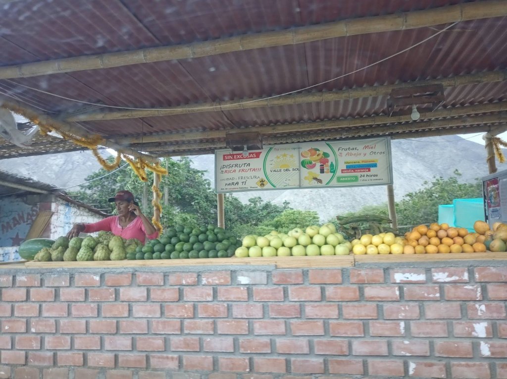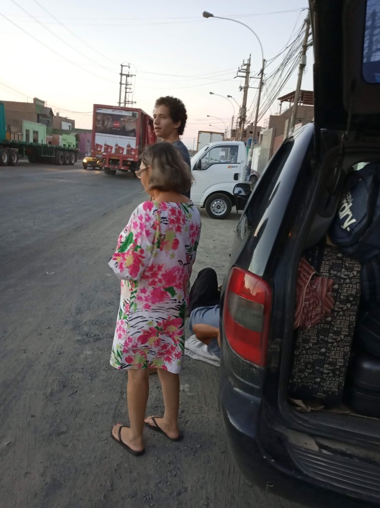 Tinha pelo menos uma venda de água. O eletricista segundo o rapaz que vendia no estabelecimento estava num povoado chamado El Porvenir uns tantos de quilômetros dali… Entrei embaixo do carro, pressionei o fundo do tanque para cima e pedi para ligar a chave, a bomba fez som de funcionamento. Soltei o fundo do tanque e a chave não acionava. Percebi que provavelmente era um mal contato nos conectores da bomba. Peguei uma chave de fenda grande e fiz de calço entre o tanque e a alça do suporte, funcionou! Eita, estamos no jogo de novo! Mas eu sabia que aquela chave poderia cair a qualquer momento, seria interessante amarrar um barbante ou arame para se ela escapasse pudesse por de novo. Não coloquei. Andei uns 40km até ela cair, foi quando chegamos em Huacho. E vimos algo parecido com um rapaz atacando uma moça na calçada… tentamos ligar para a polícia local mas não conseguimos contato, paramos em um posto de combustível para procurar uma rampa onde pudessemos baixar aquele tanque e consertar o contato…
