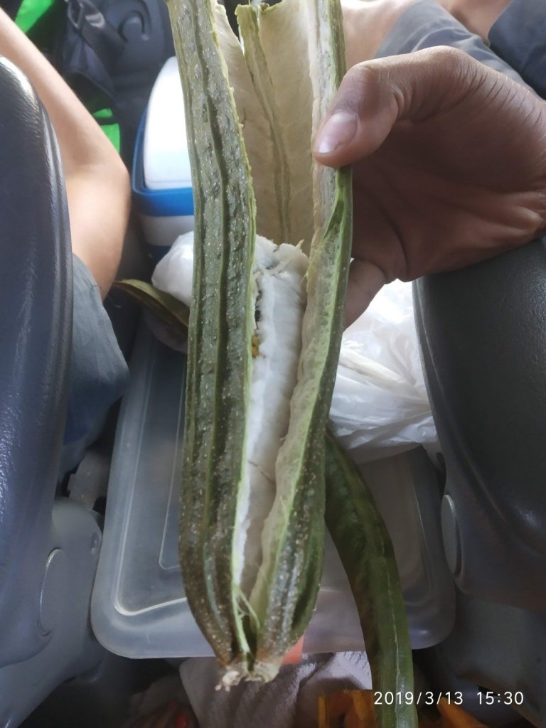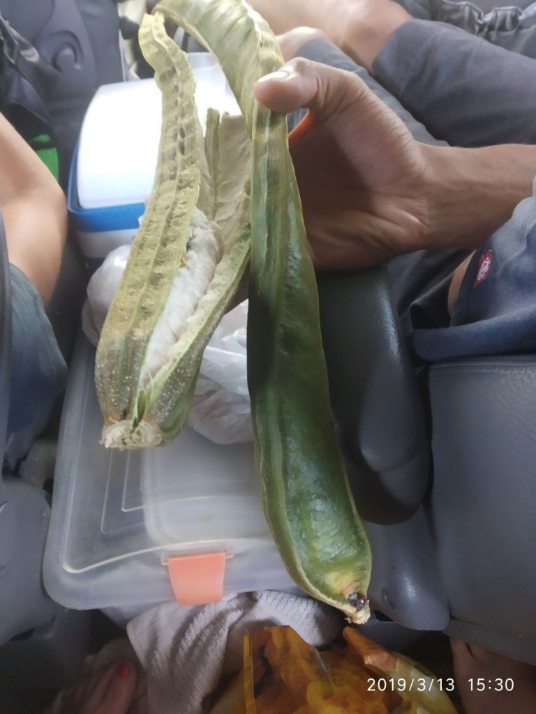 Encontramos uma quitanda na beira da estrada com uma senhor simpaticíssima! E compramos esse fruto de vagem gigantes que comemos os bagos. Um local chamado Manas.